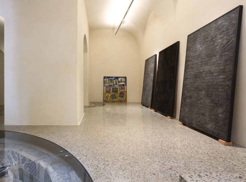 In the rest of the room there are works by Eugenio Ferretti, the Portrait of Artists as Old Men (1979), in witch Claudio Costa assembles a collection of photographs behind stained glass. Geniuses such as Einstein are juxtaposed with simple farmers from different parts of the world, alongside quotes from the Ancient Egyptian ‘Book of the Dead’; and then a drawing by Elisabeth Scherffig (Steinmetzarbeiten, 1985).